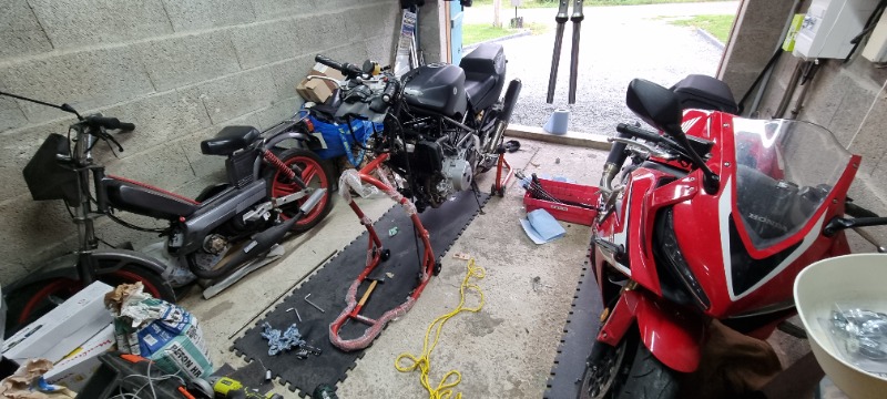 c est le bordelle dans ma tete mais l abris de jardin est monté. ca a libérée de la place pour receptionner mes machines et donc un garage libre, et dans le meme jour voici la trx 850